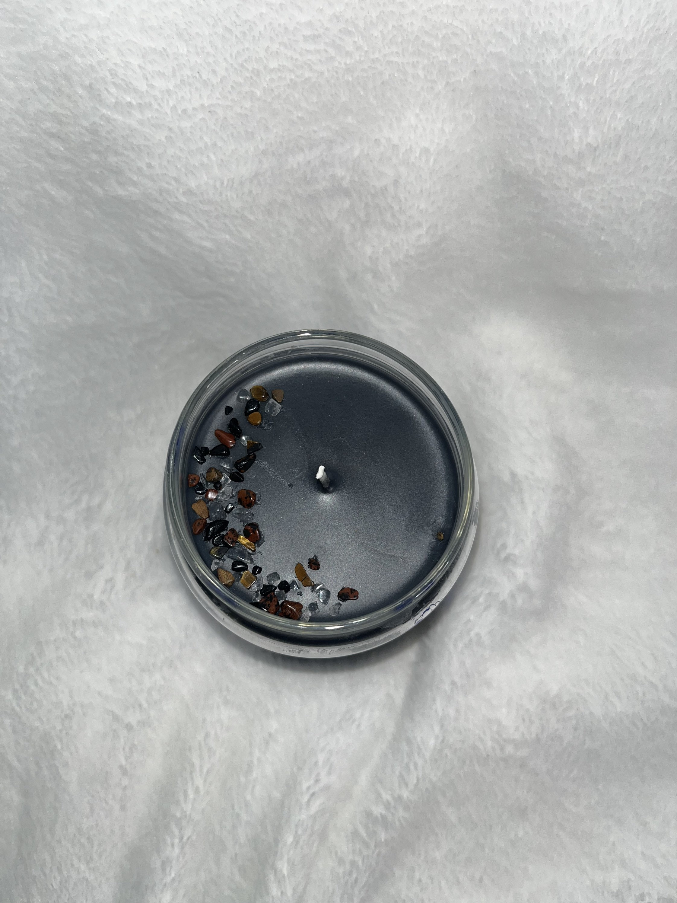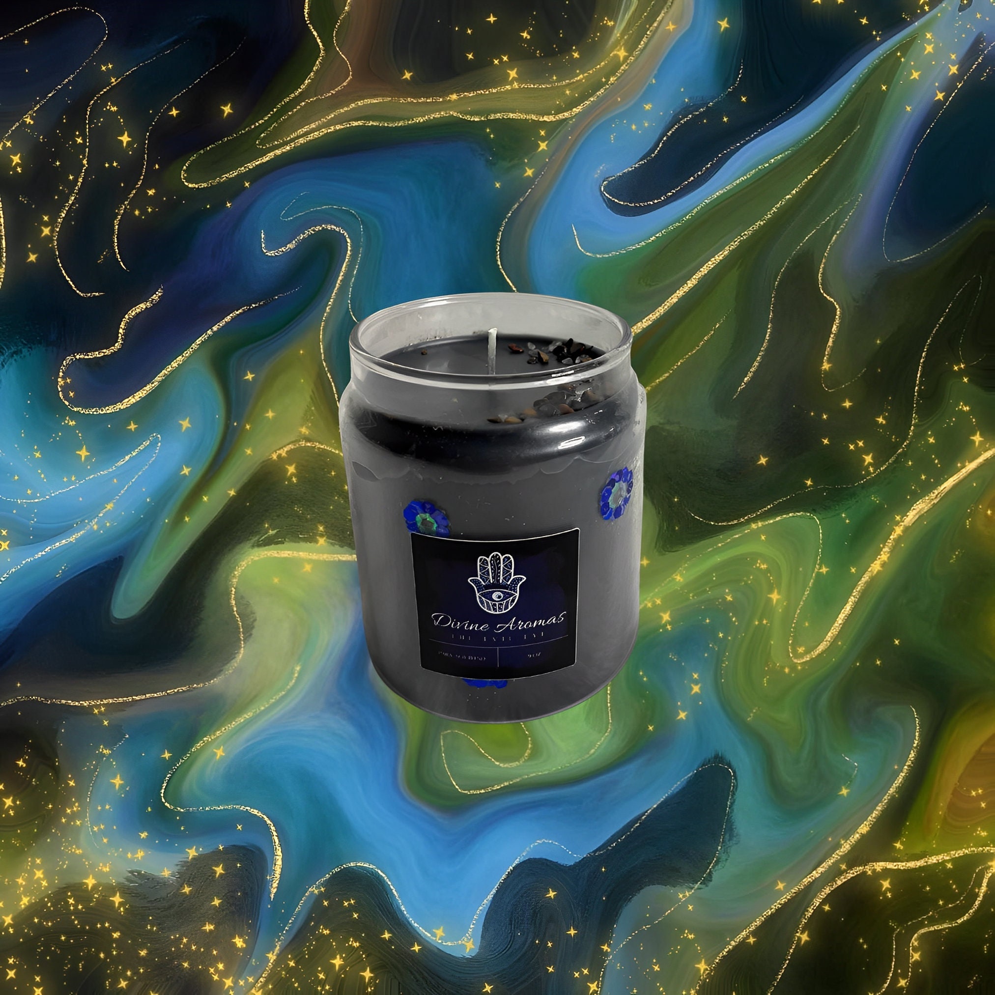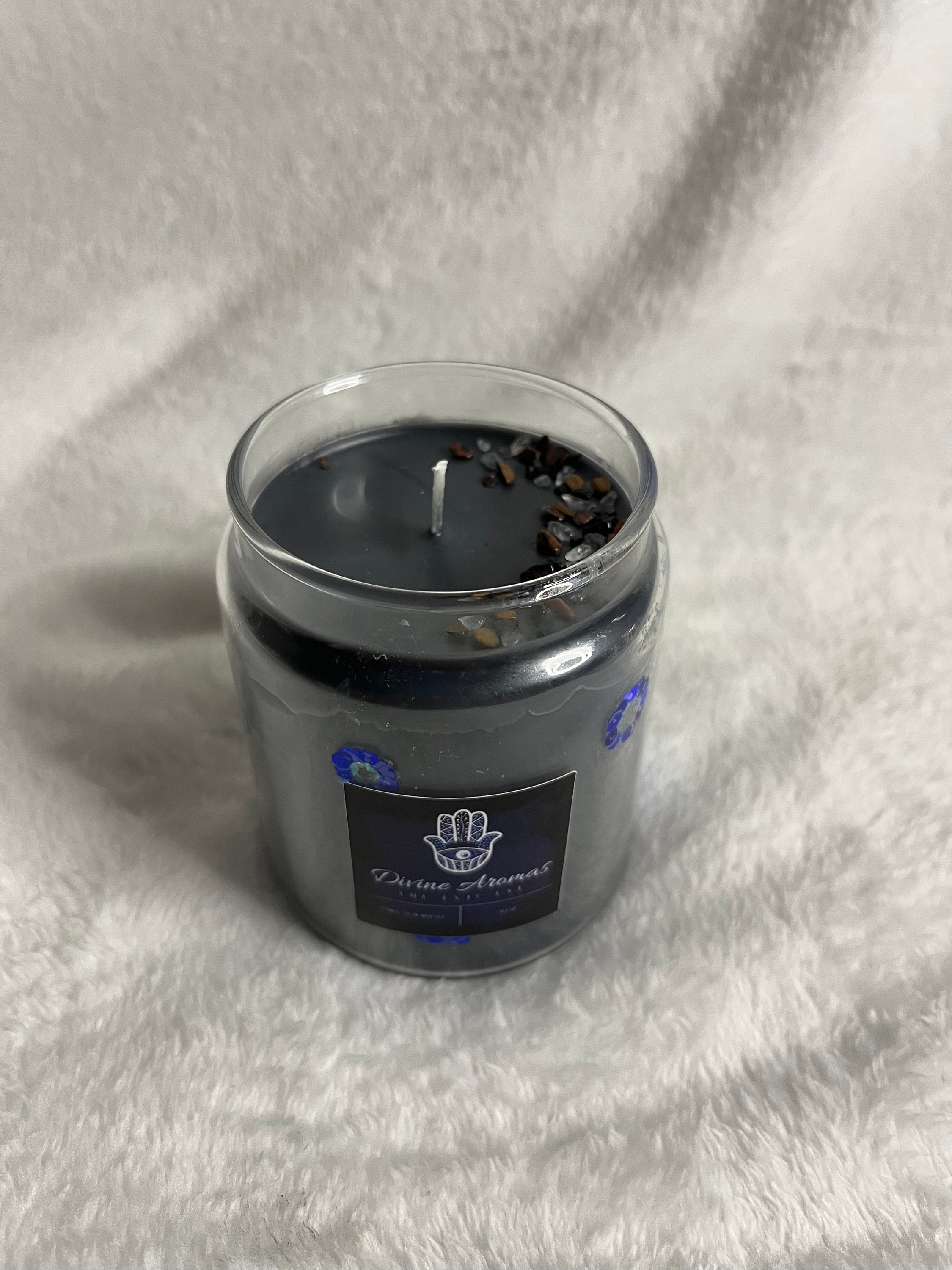 This is a smoked vanilla scented candle decorated with red obsidian, tiger’s eye, black tourmaline and clear quartz crystals. The evil eye acts as a shield that protects against all forms of bad luck that is willed onto you or your personal belongings by others.